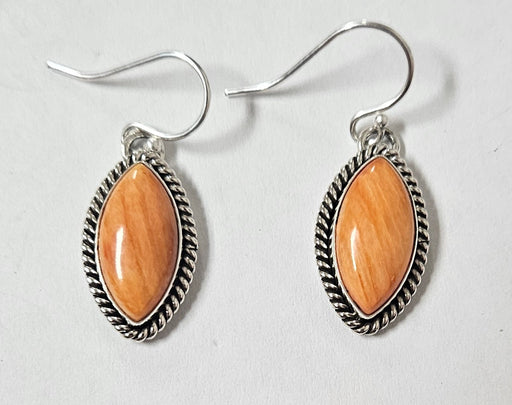 View full detailsMaterial: Orange Spiny Oyster Shell and Sterling Silver Size: 1/2" wide x 1 1/2" long Long oval Spiny Oyster Shell stone surrounded by silver tw...